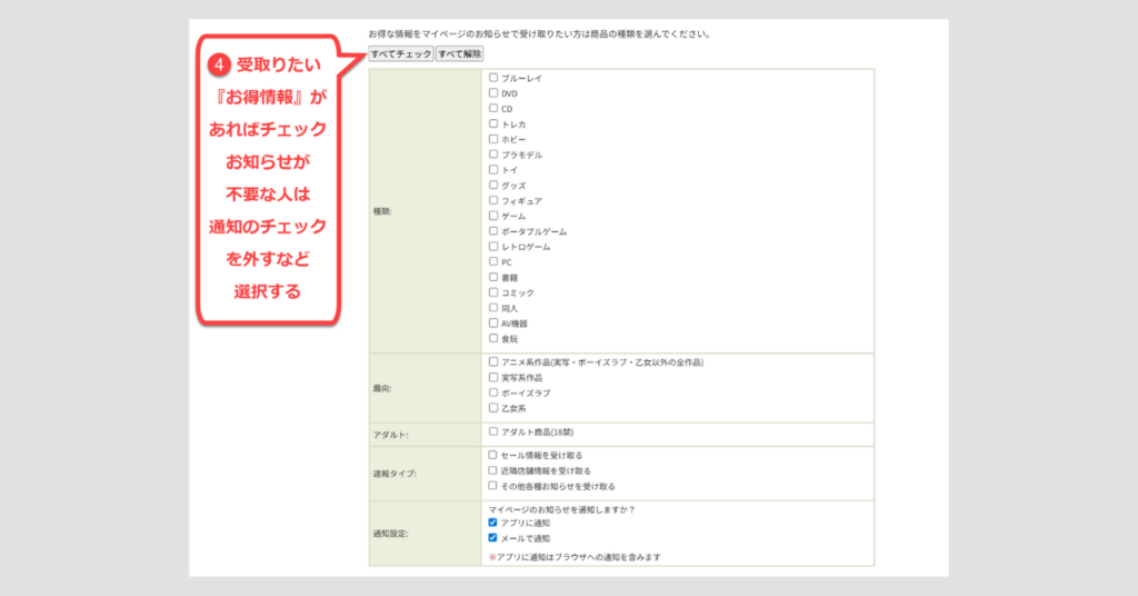 駿河屋からのお得な情報をマイページのお知らせから受け取りたい場合は、商品の種類を選んでチェックを入れておくといいです。